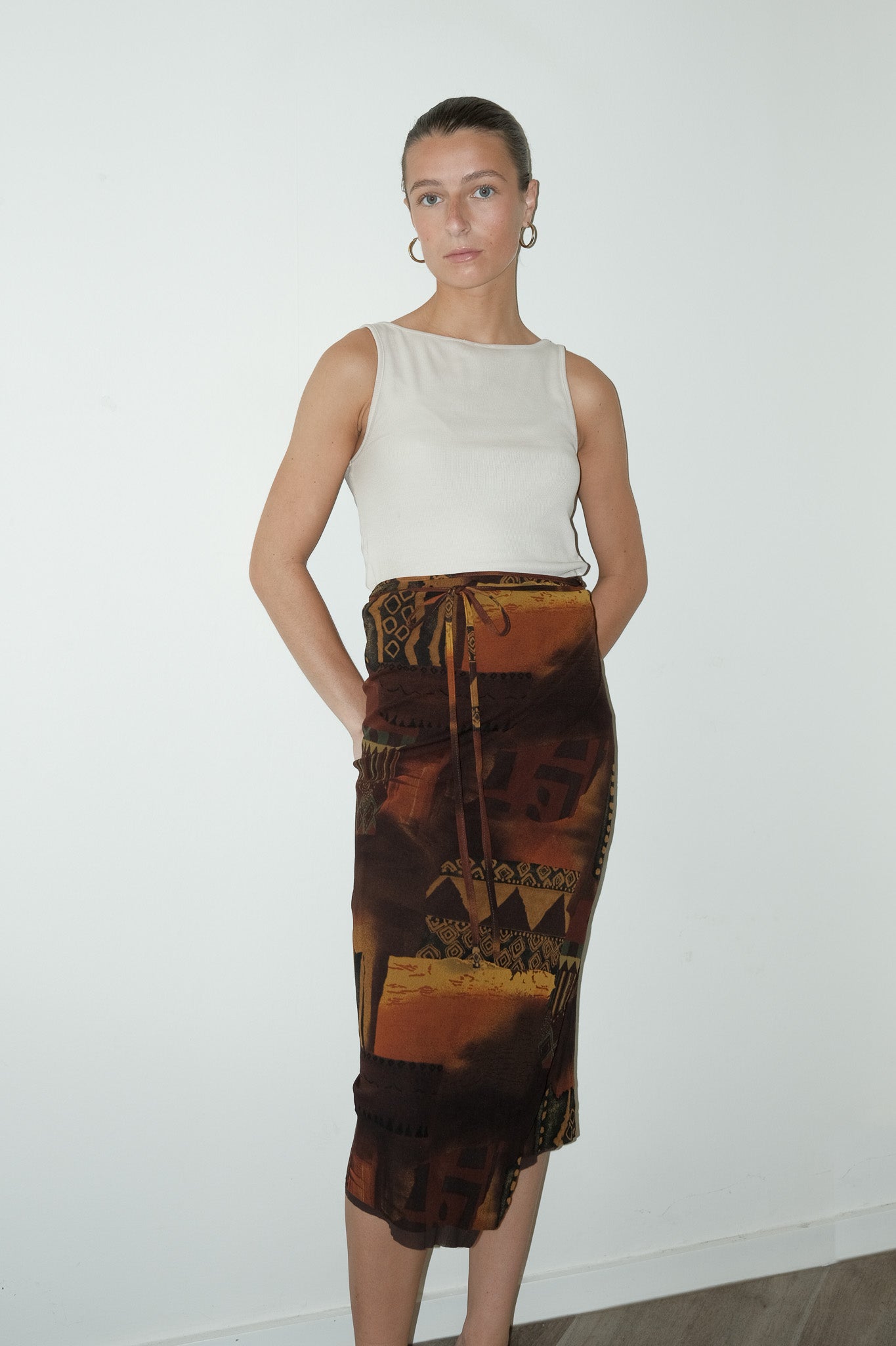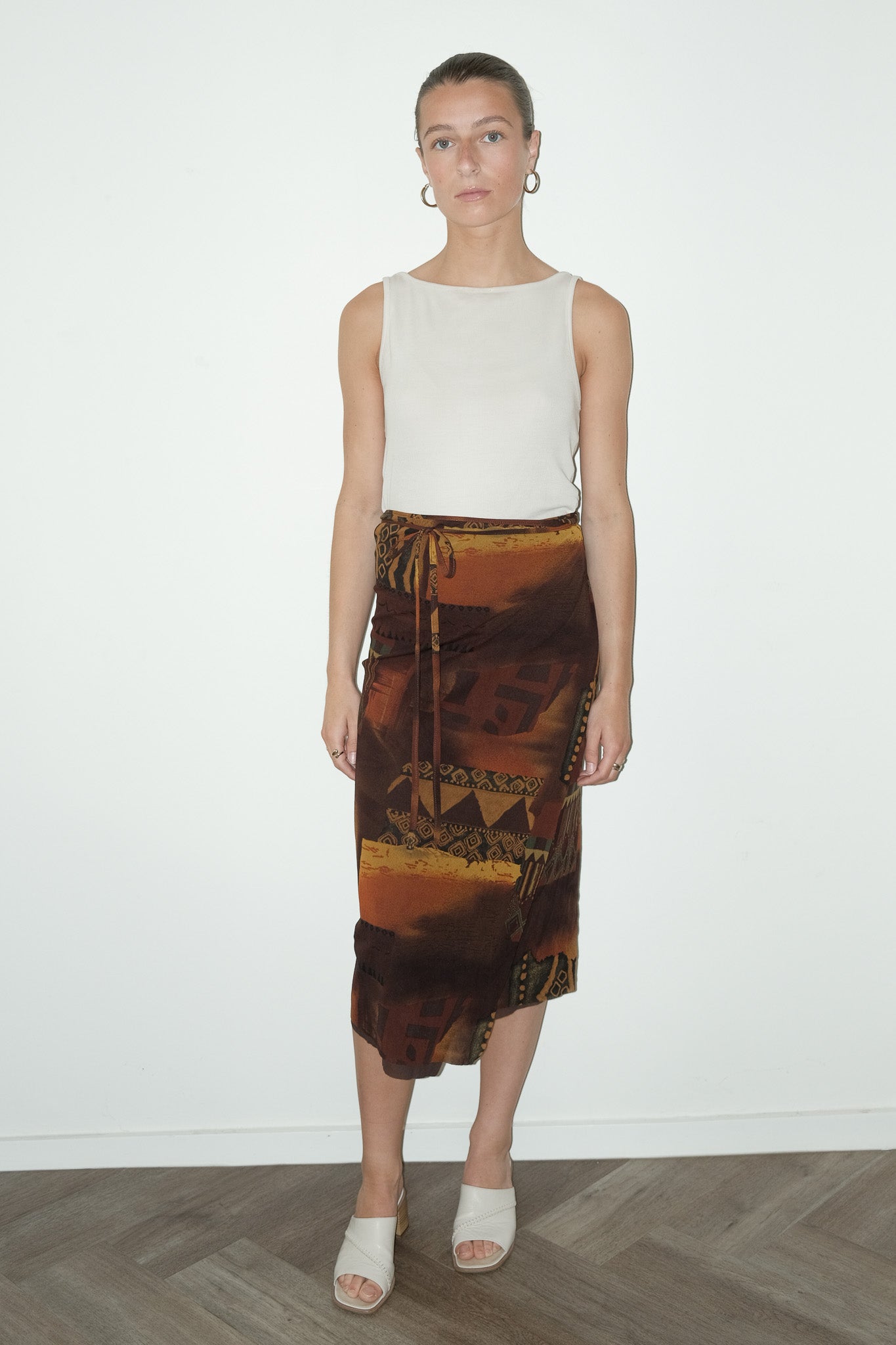 vintage donkerbruine wikkelrok met print in oranje, groen, lichtbruin & geel