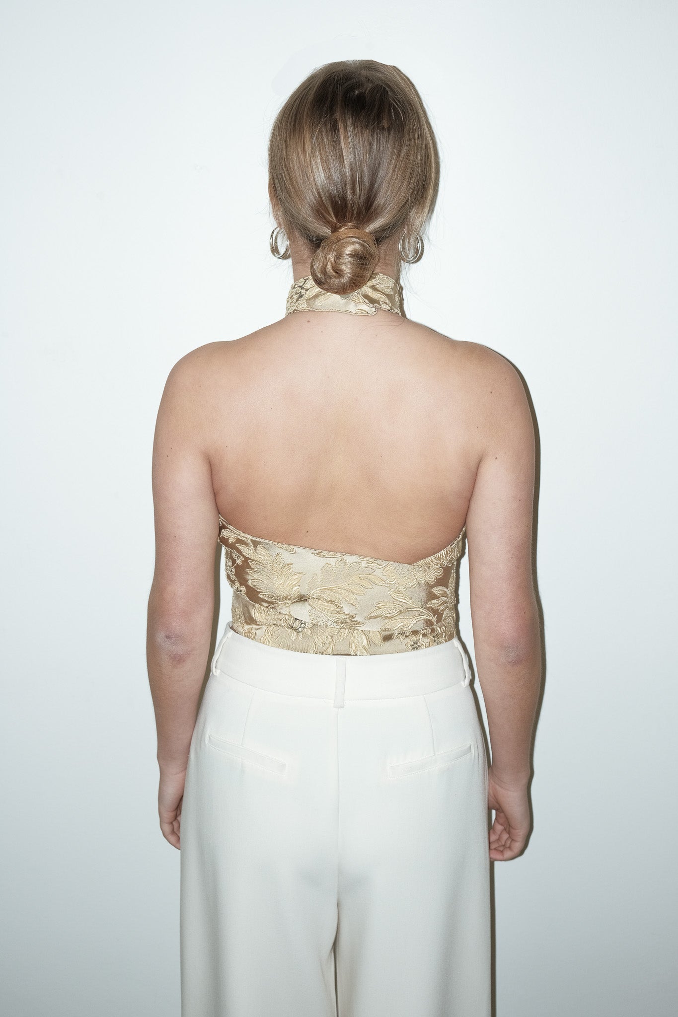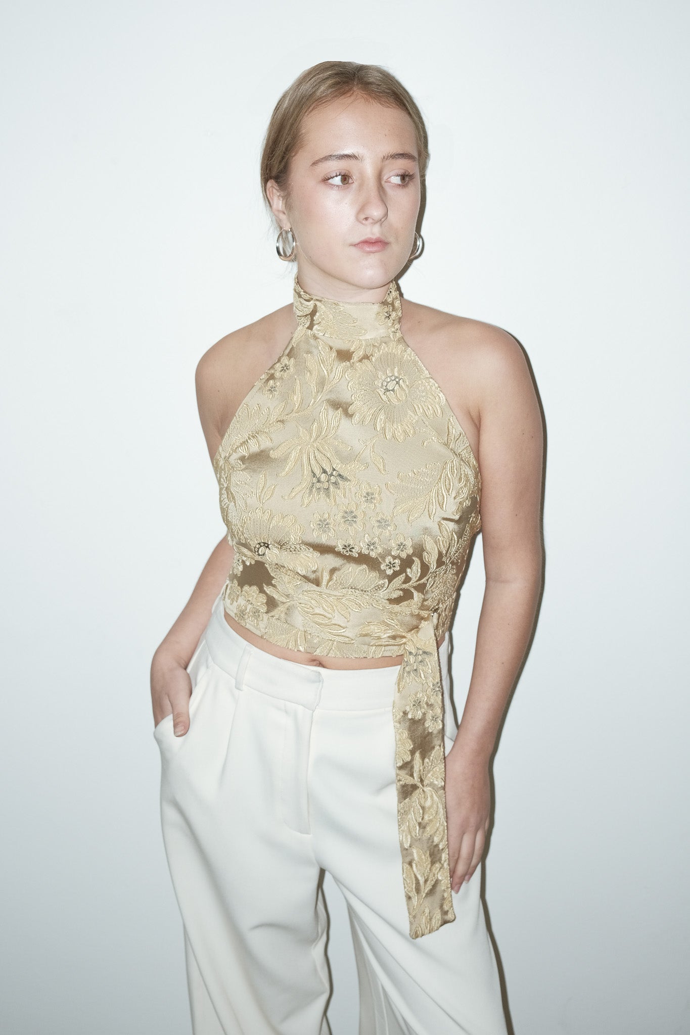 vintage gouden wrap-around haltertop met bloemenpatroon. meer geschikt voor meiden met een iets grotere cup.