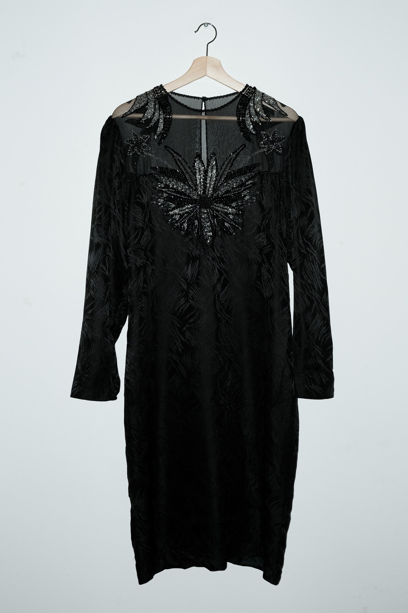 vintage zwarte jurk van 100% zijde, waarvan de bovenkant bewerkt is met kraaltjes