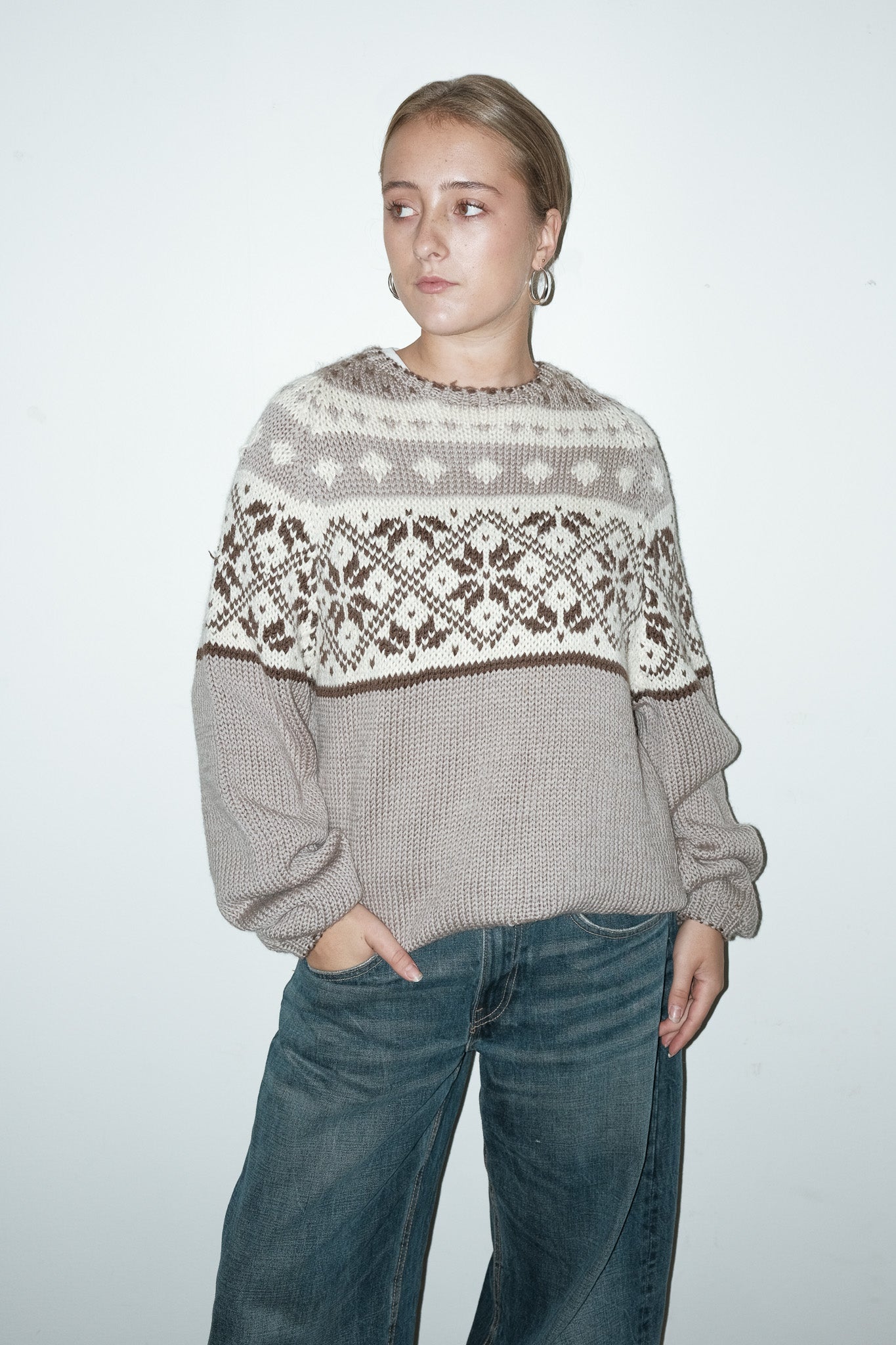 vintage scandi gebreide trui met taupe, bruin & crème
