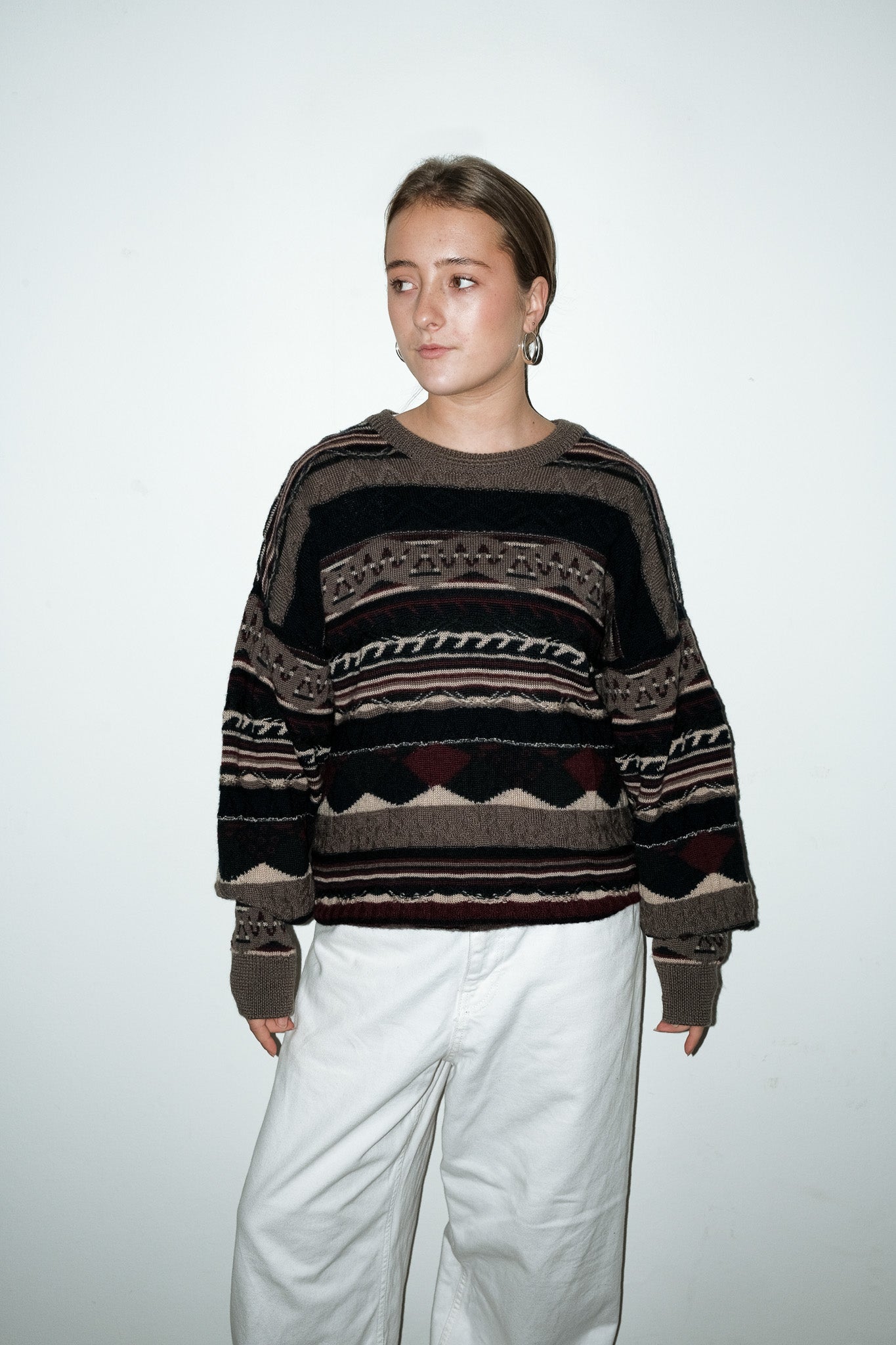vintage 100% wollen gebreide trui met donkerblauw, bordeaux & olijfgroen