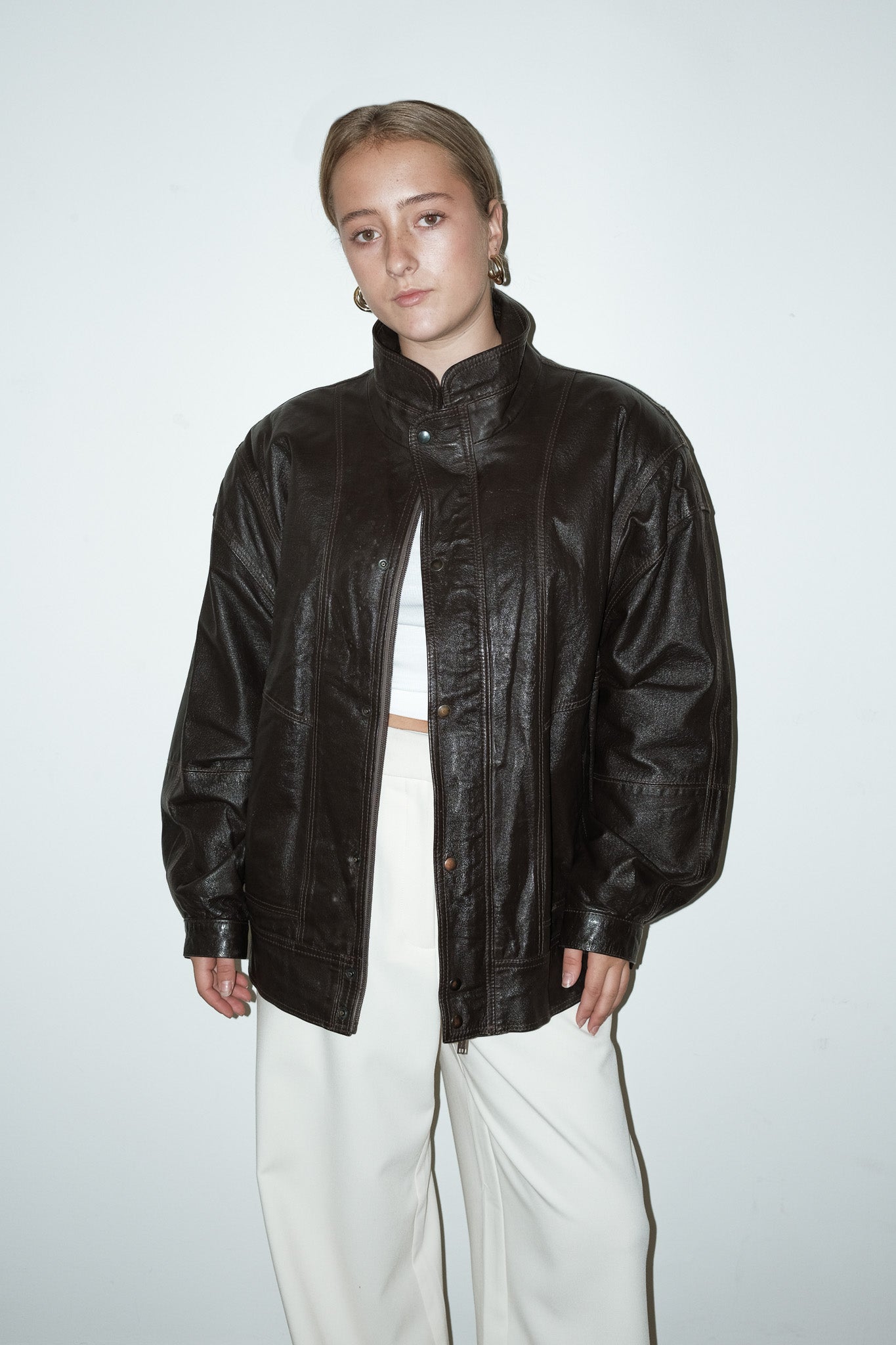 vintage donkerbruin 100% leren bomberjack met opstaande kraag