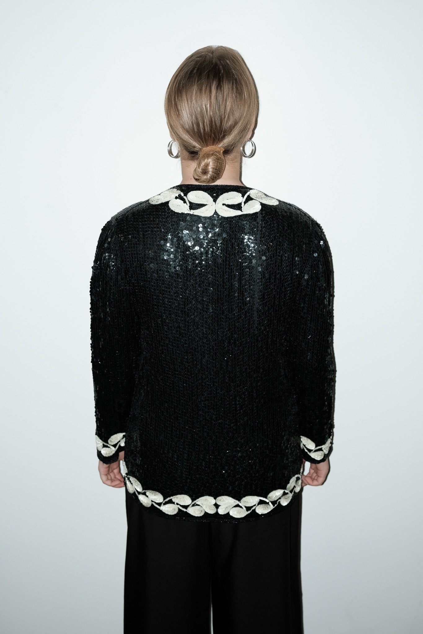 vintage zwart zijden jasje met creme en zwarte pailletten