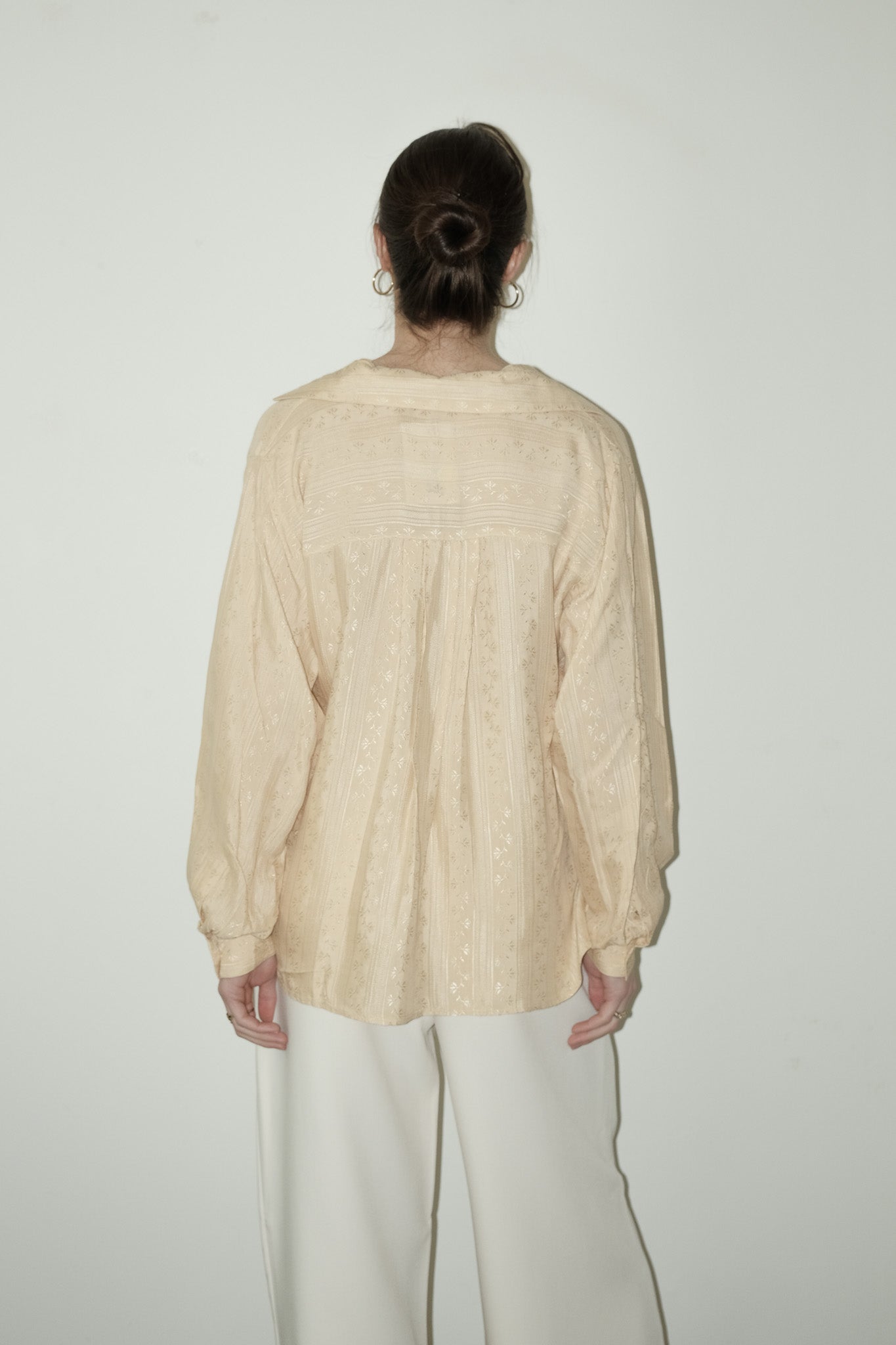 vintage v-hals blouse in botergeel met jacquard ton-sur-ton print in de stof