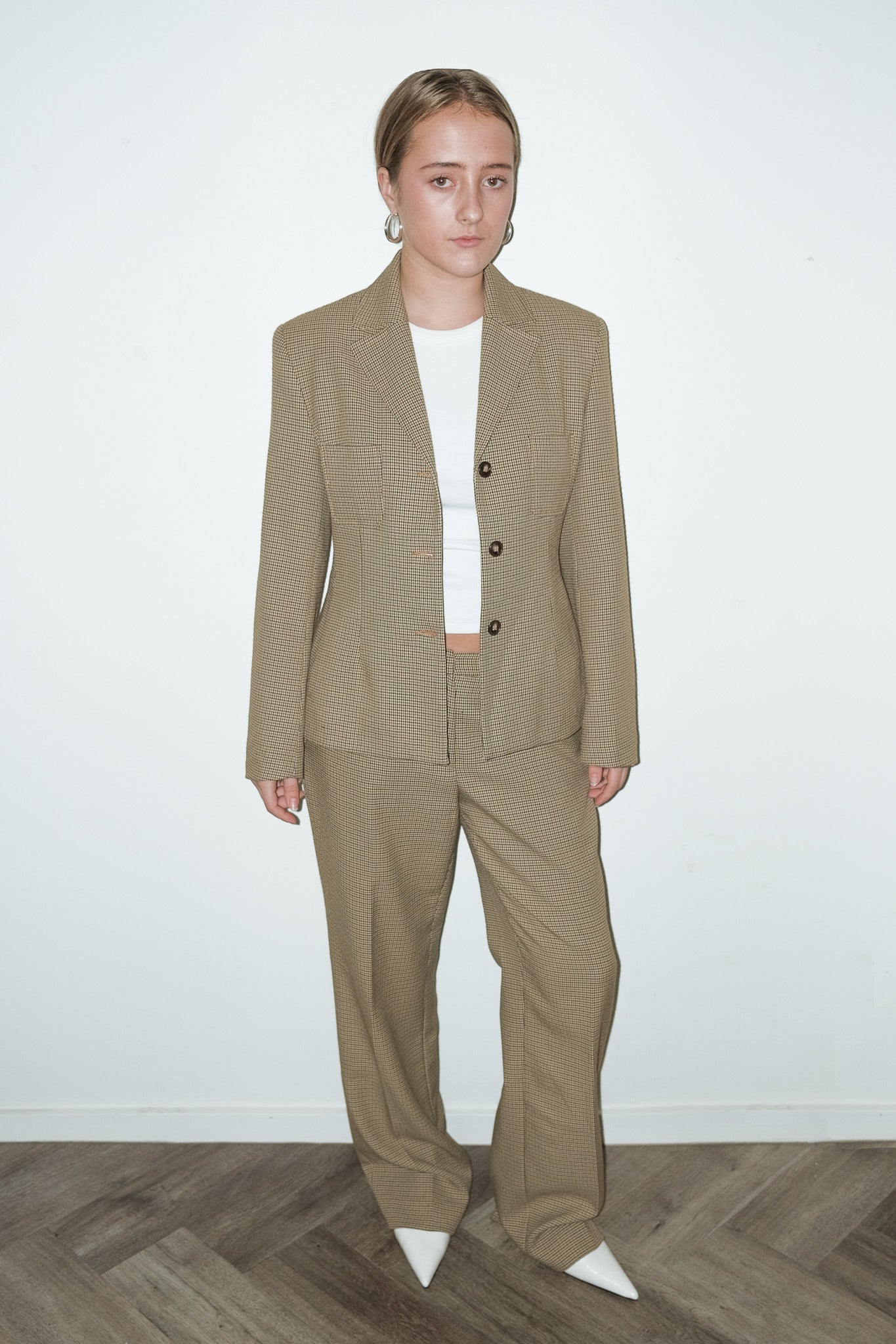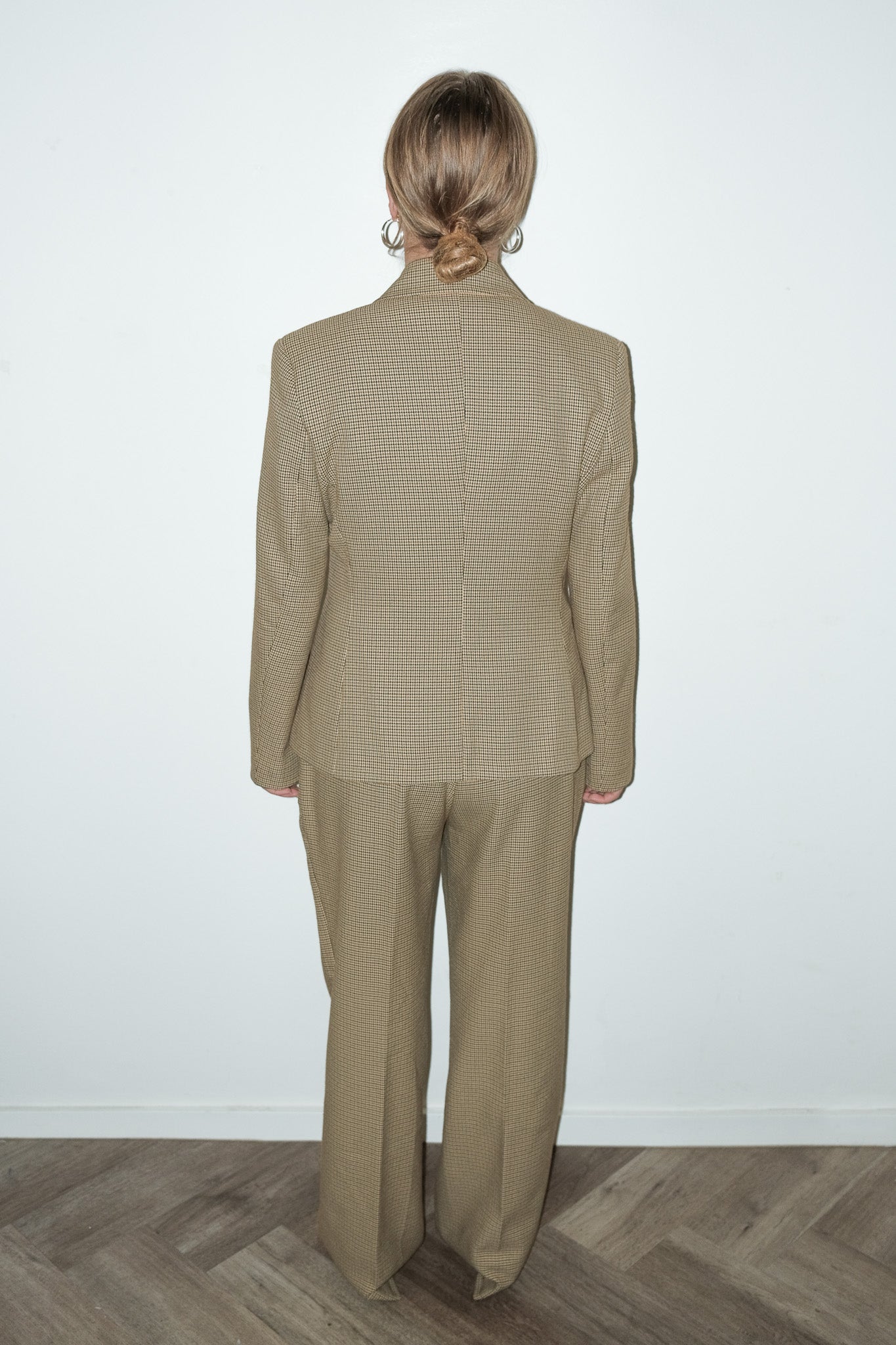 vintage beige-bruin geruit two-piece set met wide leg pantalon en fitted blazer