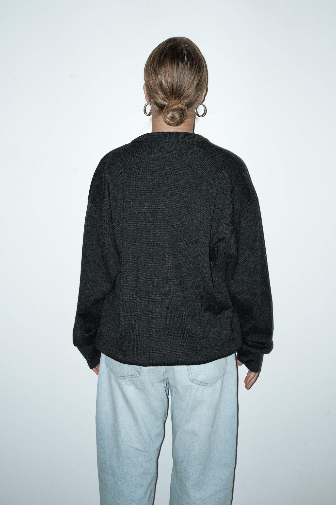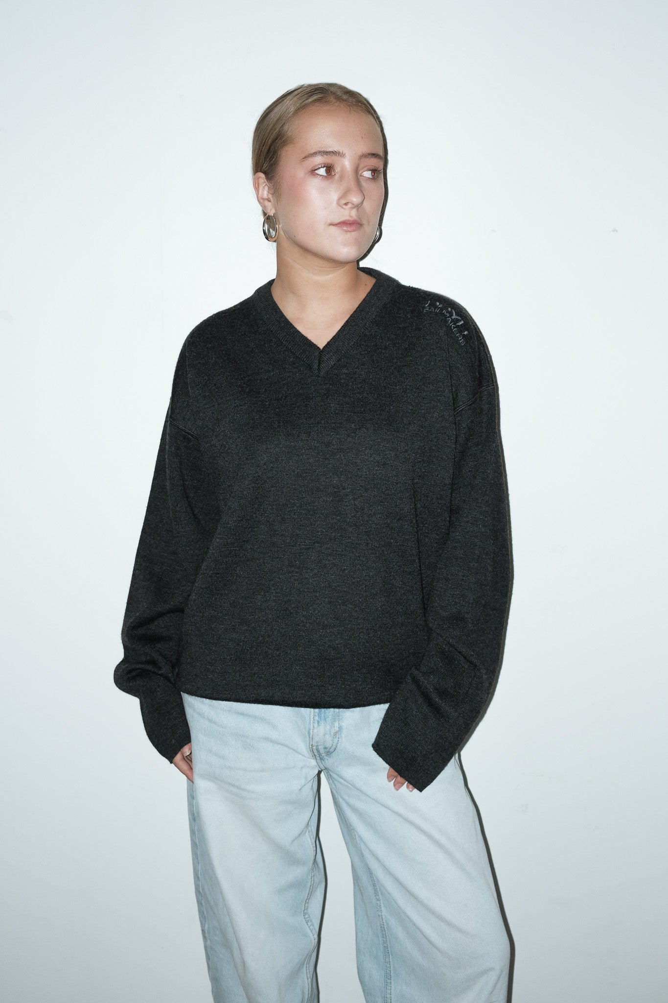 vintage donkergrijze sportygebreide trui met geborduurd logo op één schouder