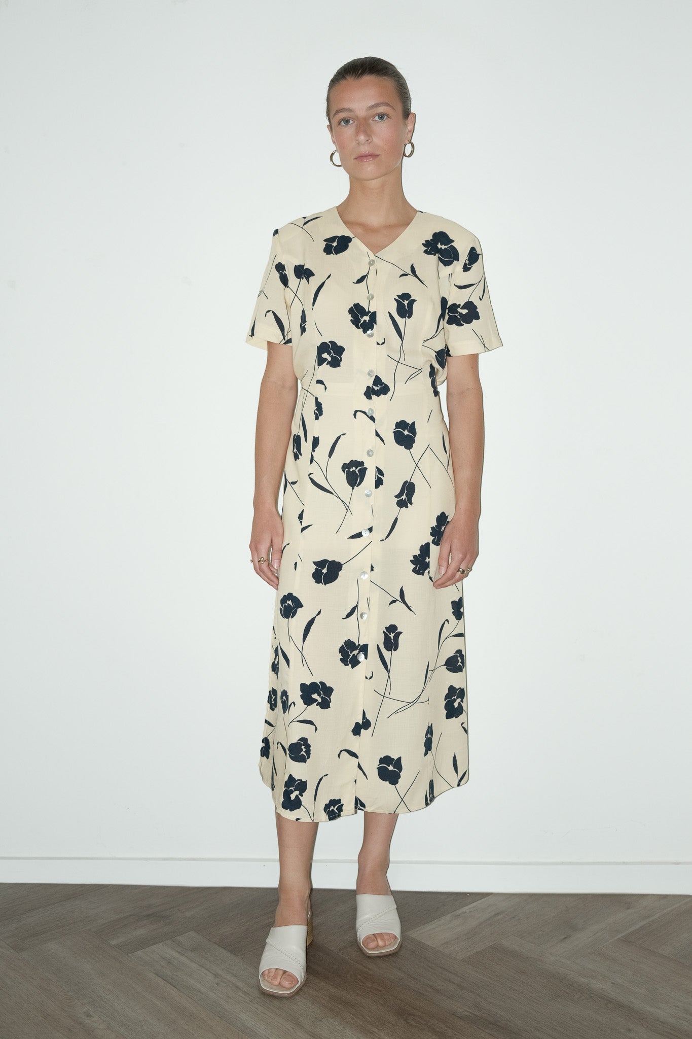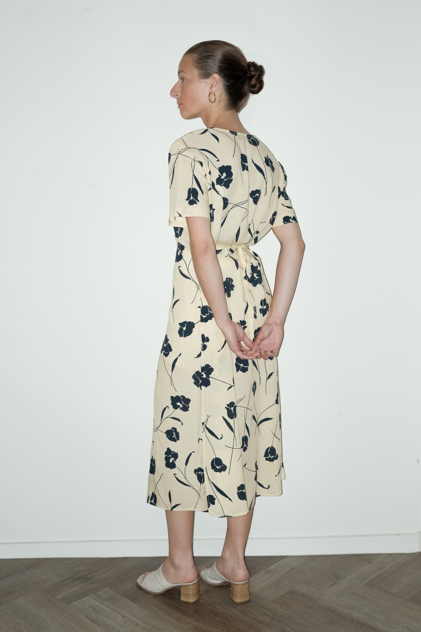 vintage franse zomerjurk in botergeel met bloemenprint en strikdetail