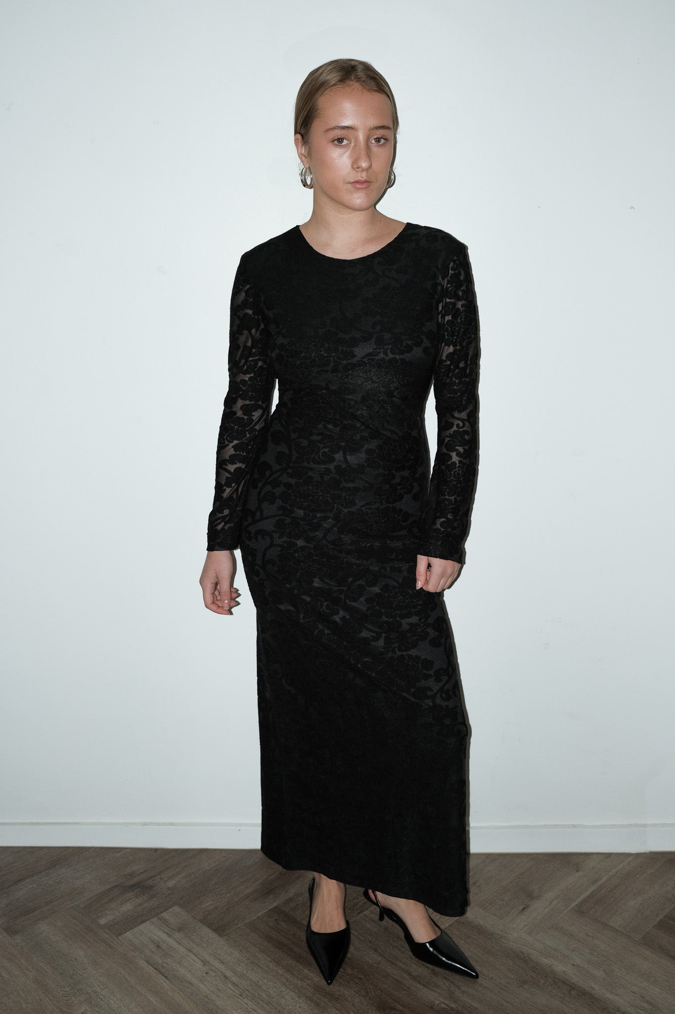 vintage zwarte maxi jurk van stretch mesh stof met zwarte bloemenprint. is gevoerd dus schijnt niet door.