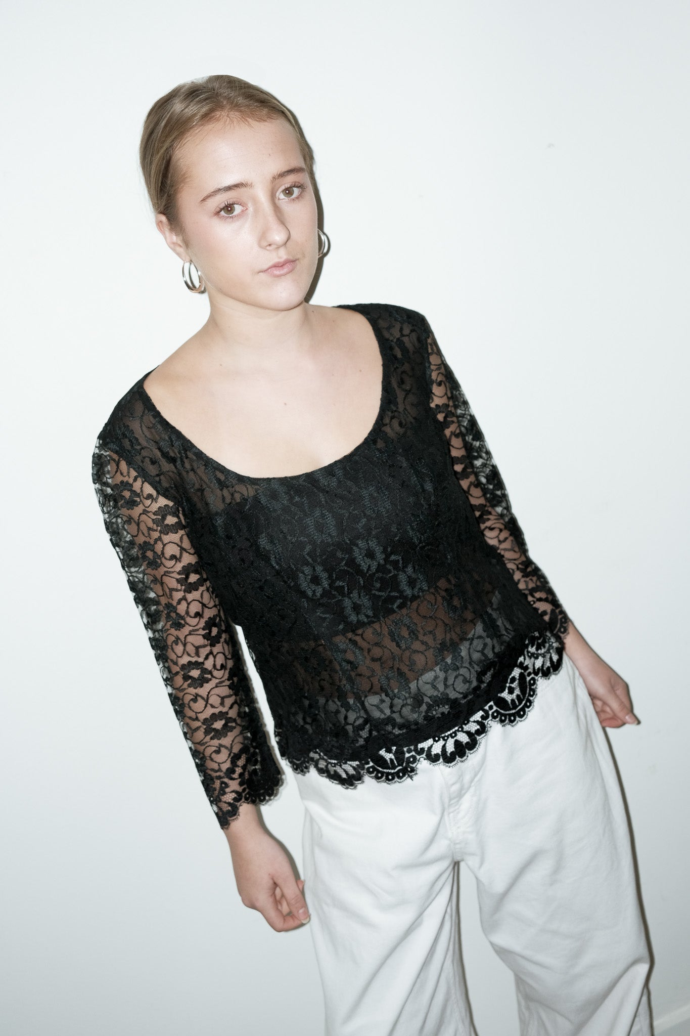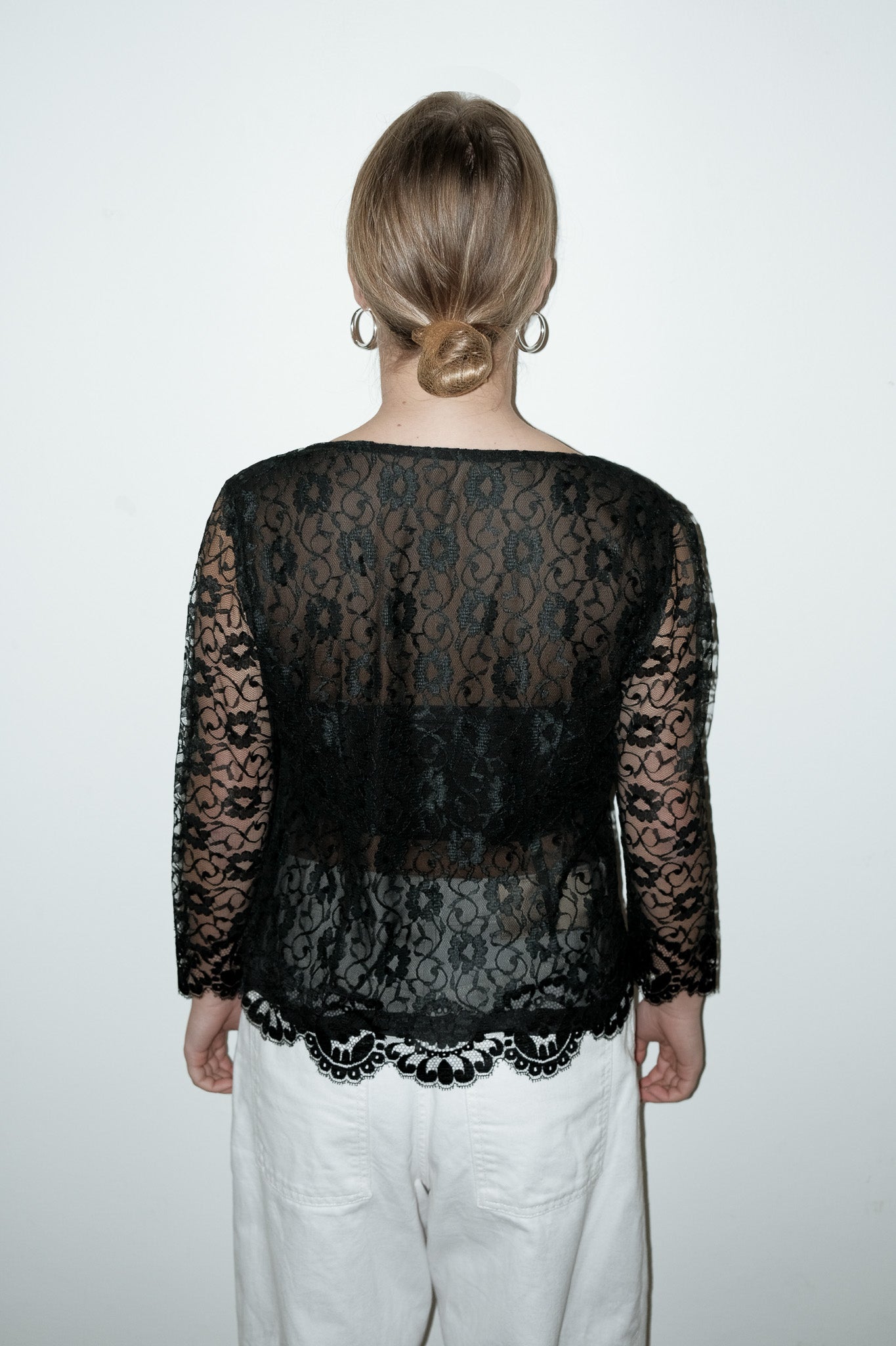 vintage zwarte kanten top met gevoerd lijfje en driekwart mouwtjes