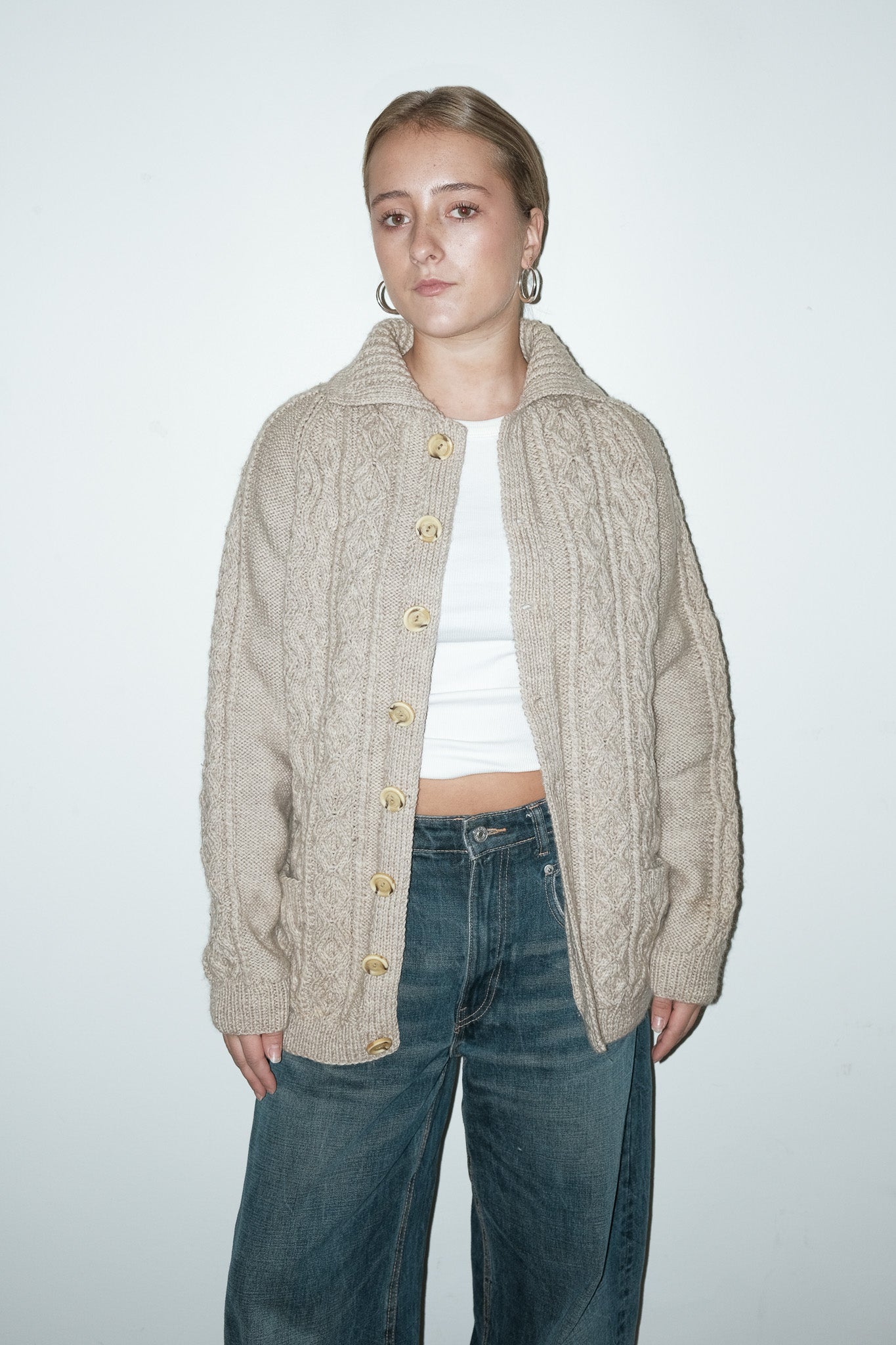 vintage beige gemêleerd gebreid vest met omgeslagen kraagje en knopen