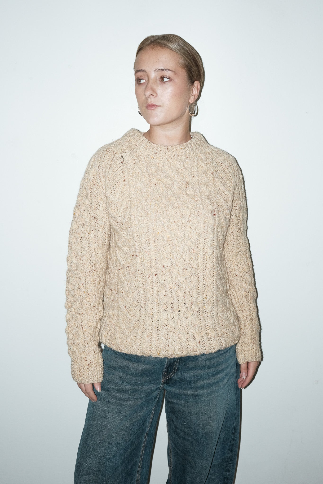 vintage camel gebreide trui met gele en rode spikkels in het breisel