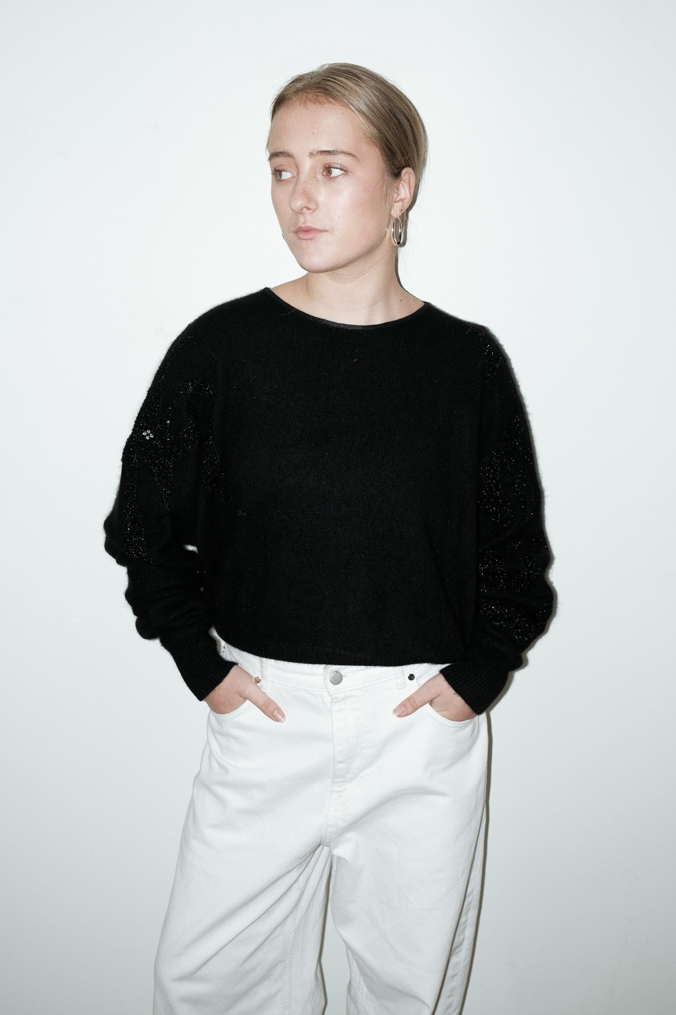 vintage zwarte cropped trui van angora-wolmix met subtiele glitterdetails op de mouwen