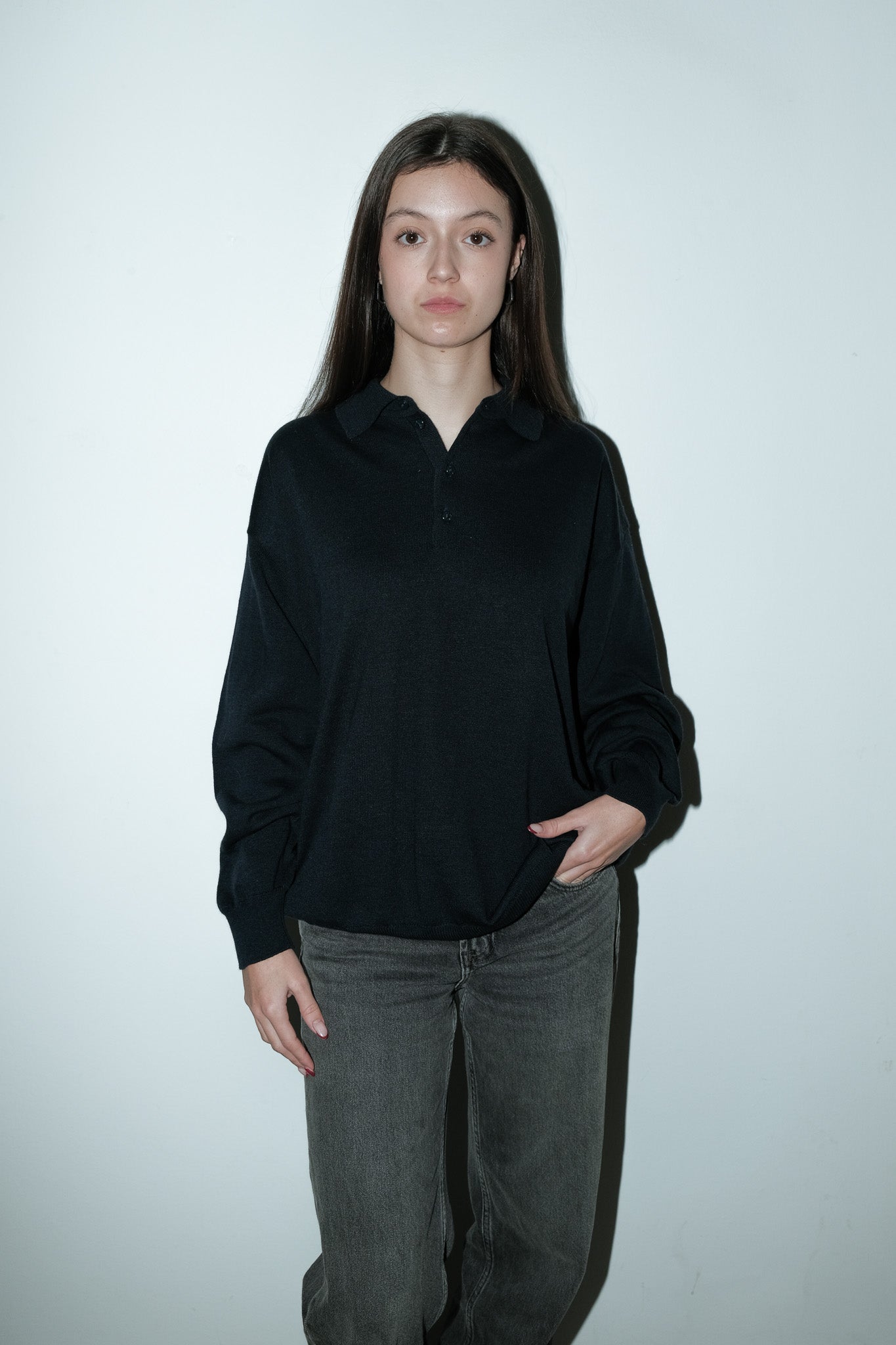 vintage donkerblauwe fijngebreide sweater met polokraagje