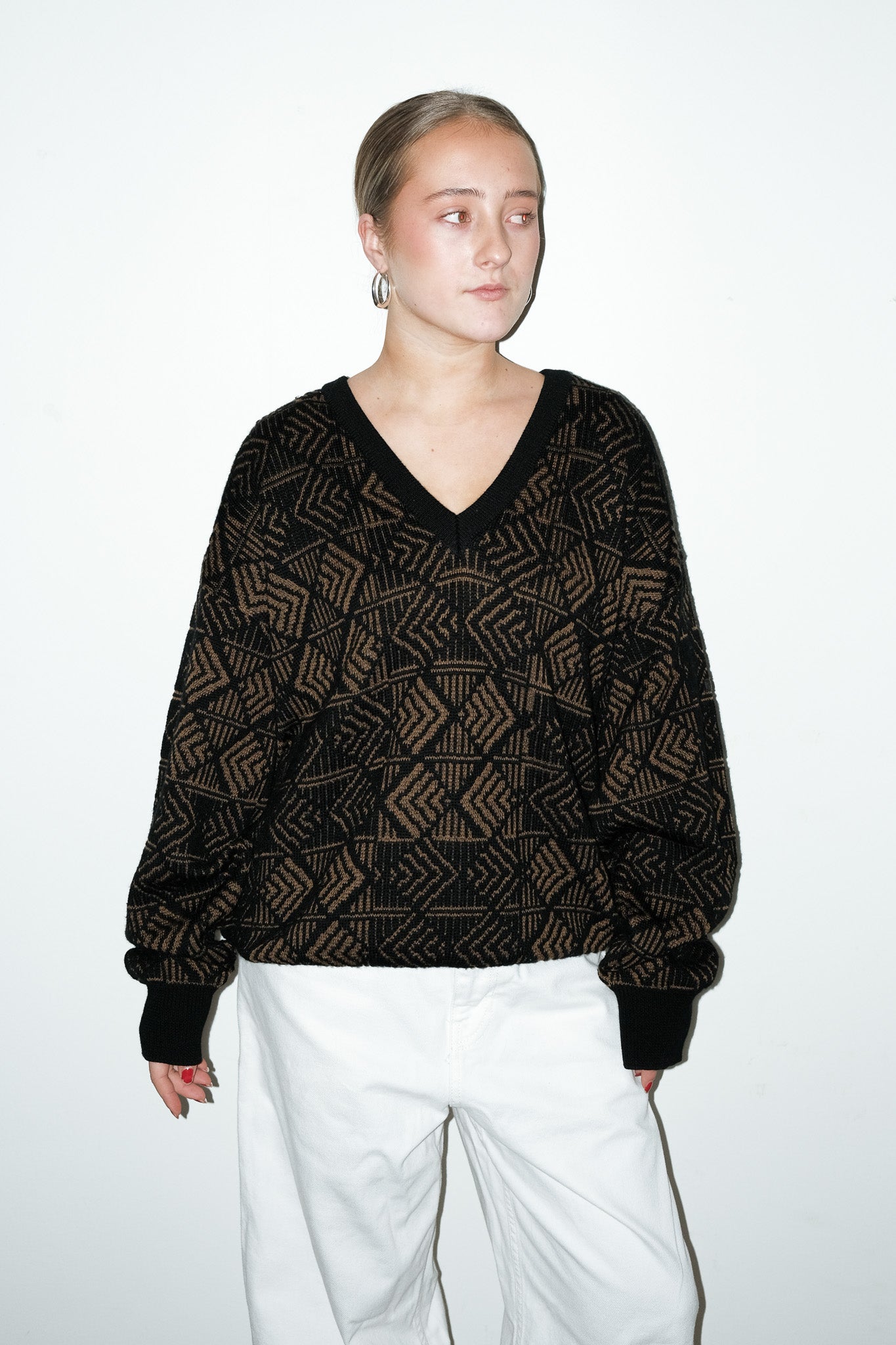 vintage zwart + camel gebreide v-hals trui van 100% wol