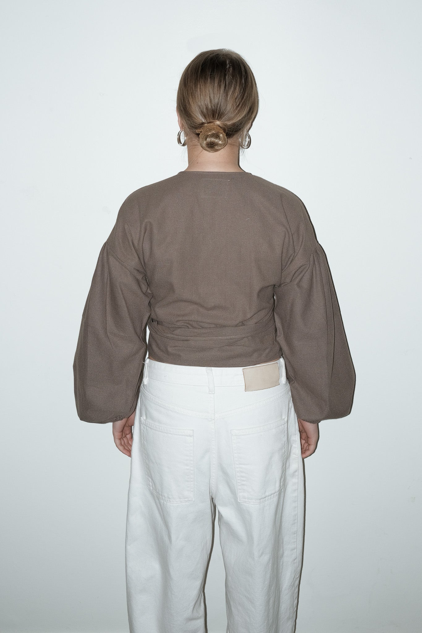 vintage reworked wikkeltop met pofmouwen in het koelbruin, gemaakt in ons eigen atelier van vintage 100% linnen gordijnstof.