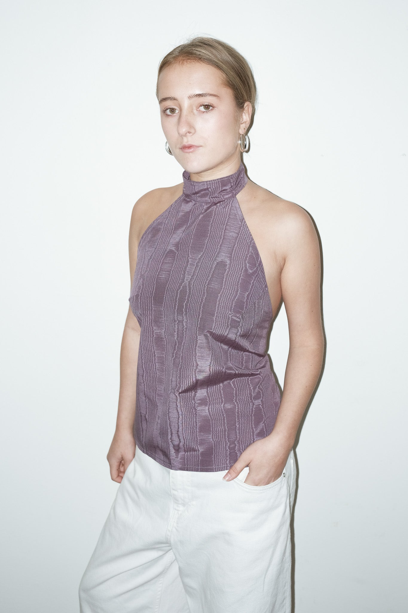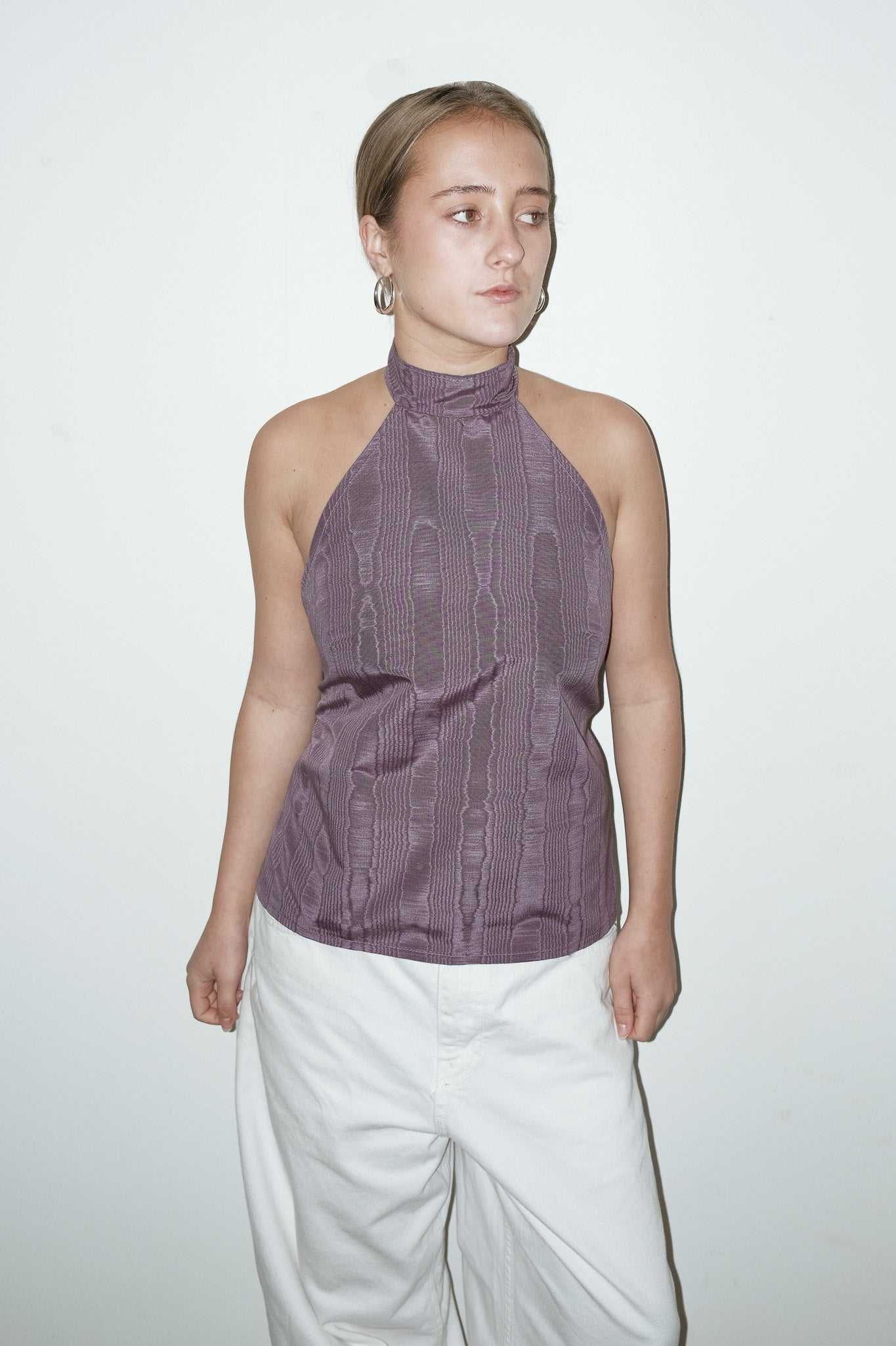 vintage zachtpaarse glanzende reworked haltertop met twee gespjes op je rug om de top te verstellen. gemaakt in ons eigen atelier van een luxe vintage stof.