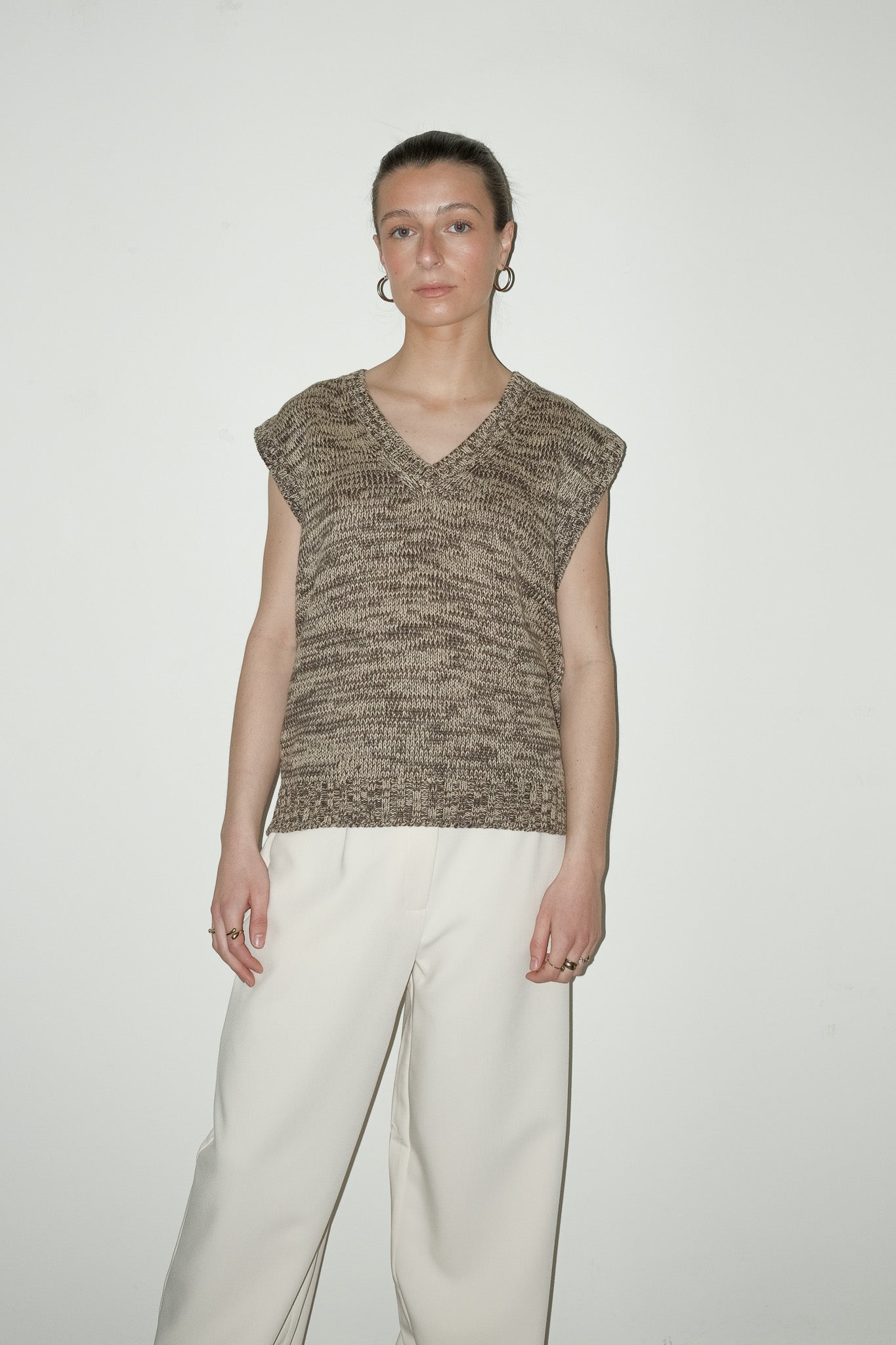 vintage gebreide gemêleerde beige en donkerbruine spencer