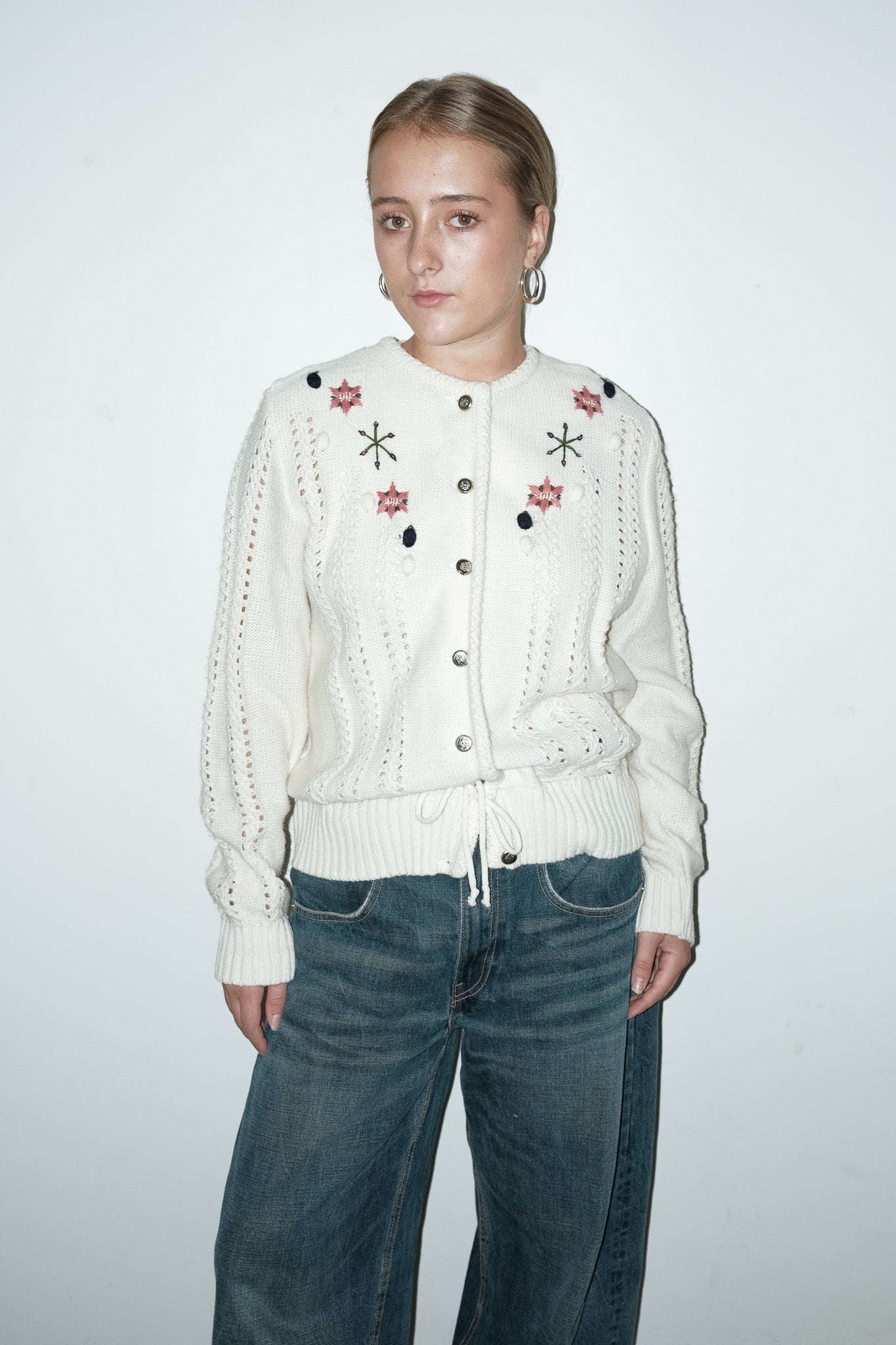 vintage crème gebreid vest met geborduurde bloemetjes als details. je kunt 'm strikken in je taille