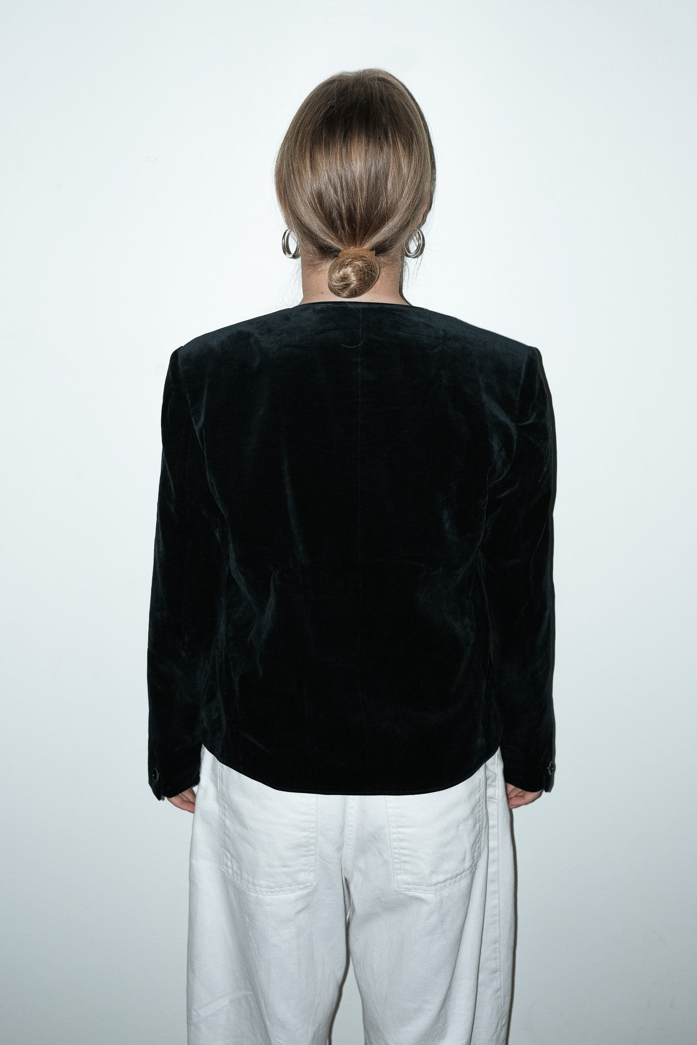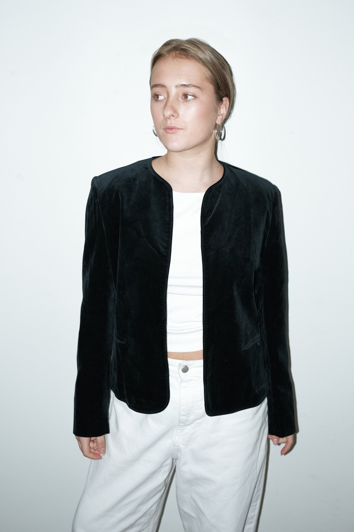 vintage zwart katoenvelvet jasje (zonder knoopjes). wij raden 'm aan voor XS, want dan valt 'iets meer oversized. Maar met S past het jasje ook.