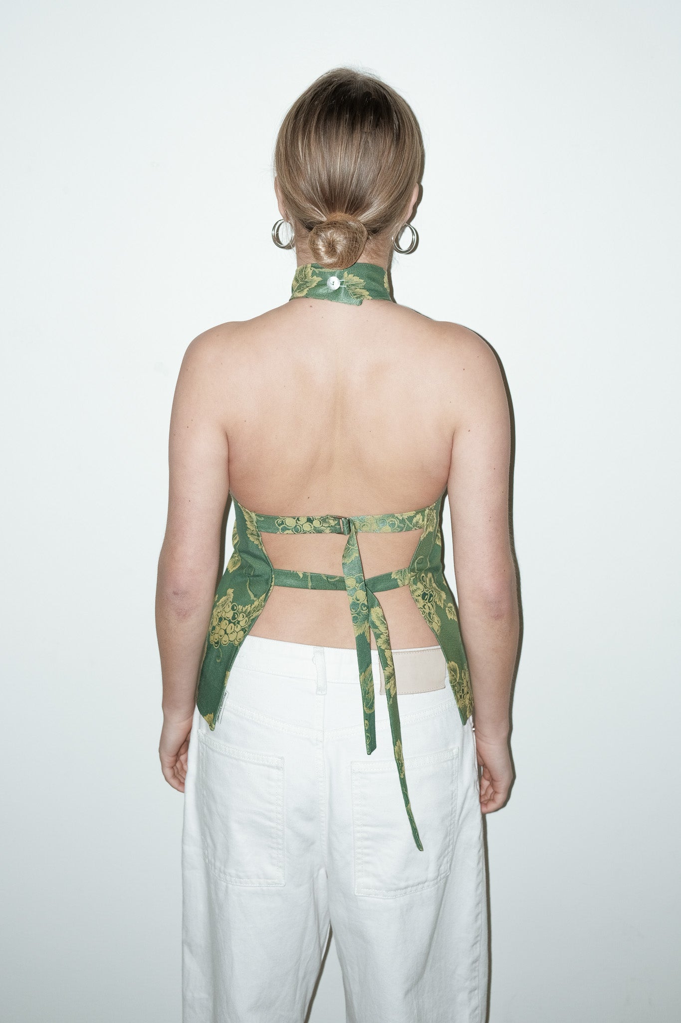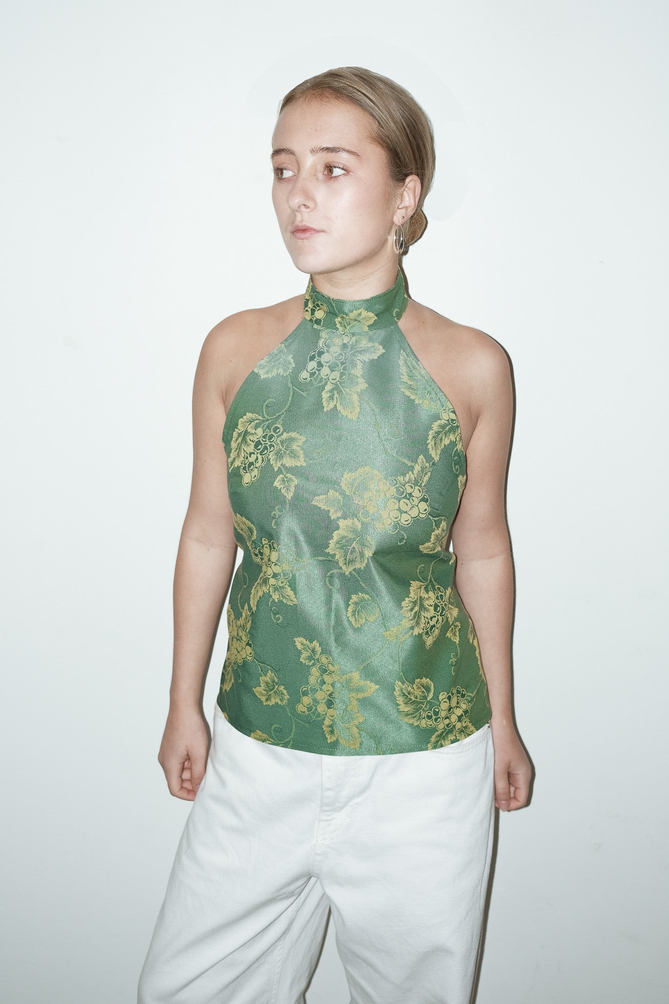 vintage groene druivenprint reworked haltertop met twee gespjes op je rug om de top te verstellen. gemaakt in ons eigen atelier van een luxe vintage stof.
