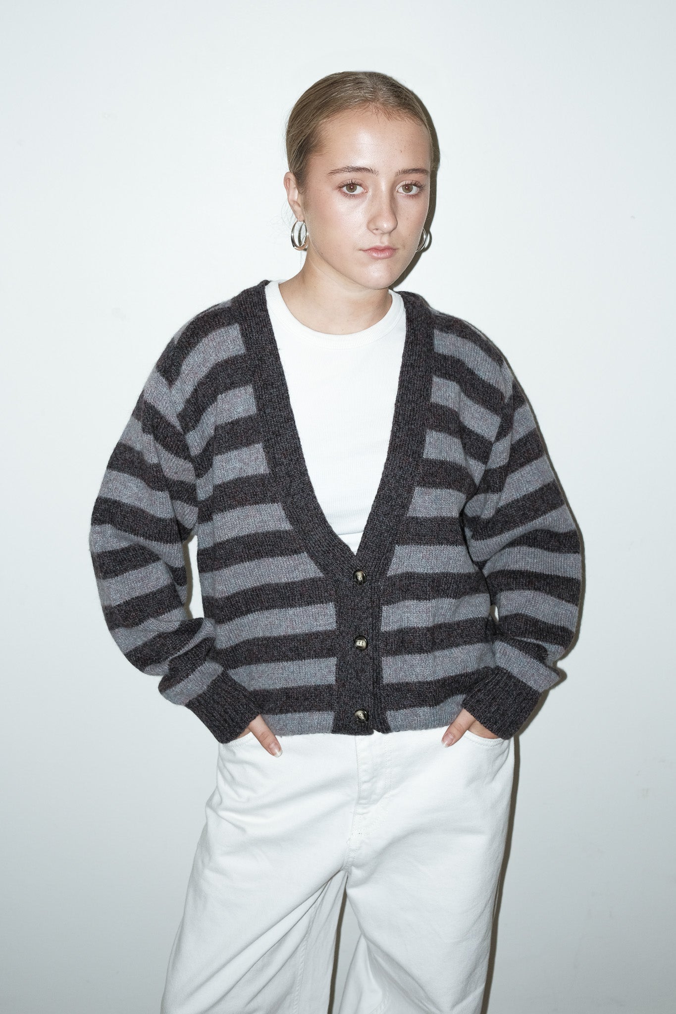 vintage gestreept v-hals vest van 100% wol. het donkergrijs is een beetje paarsig en het lichtgrijs een beetje blauwig.